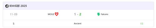 在IEM成都2025季军争夺战中,Falcons战队以2-1的比分击败MOUZ,获得本届赛事季军。三张地图的比分分别为Ancient 13-5、Inferno 11-13和Mirage 13-6。