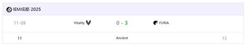 首张地图Ancient上,FURIA展现出更强的团队配合。molodoy以1.28 Rating领跑全场,yuurih和YEKINDAR分别贡献1.26和1.21 Rating。Vitality方面mezii打出1.14 Rating,但整体状态不及对手。双方比分紧咬至11-11平,关键时刻FURIA连拿两分,以13-11先下一城。