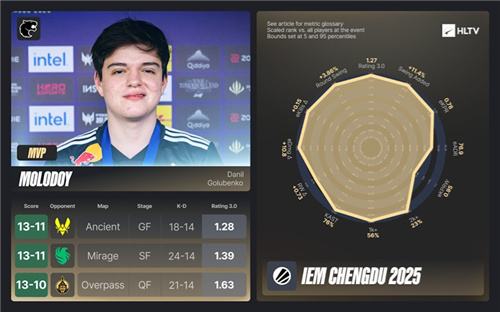 2025年IEM成都站落下帷幕,HLTV官方公布了本届赛事的EVP(杰出选手)名单及全明星阵容。FURIA战队成为最大赢家,共有四名选手入选EVP,其中哈萨克斯坦狙击手molodoy荣膺赛事MVP。