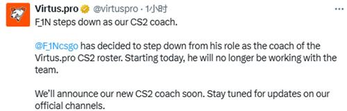 俄罗斯电竞俱乐部Virtus.pro今日宣布,CS2分部教练F_1N正式离职。这位教练在任职7个月后突然辞职,俱乐部表示将在近期公布新任教练人选。