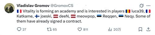消息称Vitality有意签下多位年轻选手,包括罗马尼亚的luca39、法国的Katkame、芬兰的joeski、拉脱维亚的deeN以及meowpop、爱沙尼亚的Reqqen和Neqy。据悉部分选手已经签署了合约。这份名单显示出Vitality在欧洲范围内广泛挖掘新秀的战略布局。