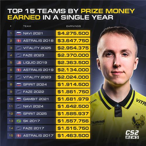 Vitality凭借2025年前半段的强势表现,包括8个大赛冠军和英特尔大满贯的丰厚奖金,目前位列年度奖金榜第三名。然而,即使他们赢得即将到来的布达佩斯Major(冠军奖金50万美元),仍无法超越Astralis在2018年(差距约69万美元)和Natus Vincere在2021年创下的历史纪录。