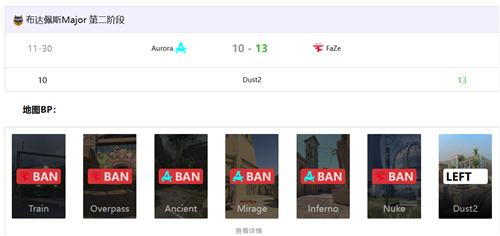 在布达佩斯Major第二阶段1-0组的激烈对决中,FaZe Clan以13-10力克Aurora,Twistzz和jcobbb分别贡献1.74和1.53的Rating成为取胜关键。