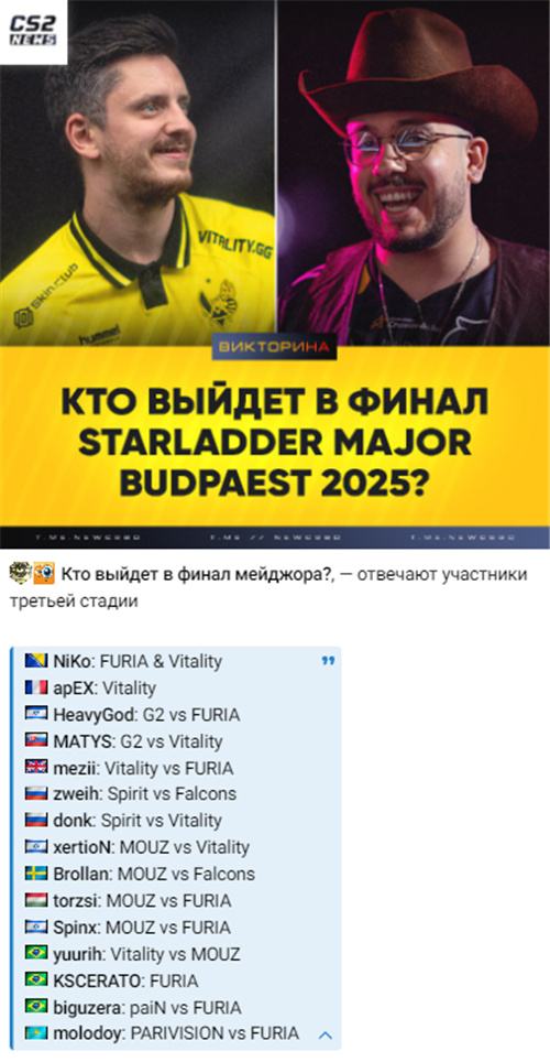 在布达佩斯Major赛事期间,俄媒CS2NEWS收集了多位参赛选手对决赛对阵的预测。这些来自赛场一线的见解,展现了职业选手眼中的Major争冠格局。