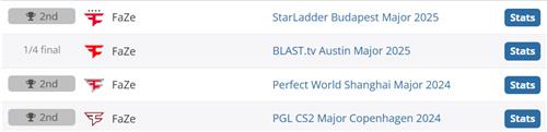 在布达佩斯Major决赛1-3不敌Vitality后,FaZe战队延续了他们在CS2时代的尴尬纪录——连续三届Major闯入决赛却全部屈居亚军。这支国际纵队已成为CS史上最具悲情色彩的战队之一。