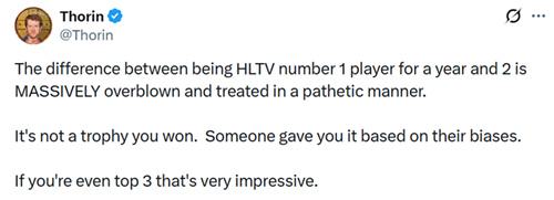 知名分析师Thorin近日在社交媒体上炮轰CS社区的排名狂热,认为过度夸大Top1与Top2之间的差距是"可悲的输家思维"。他强调HLTV年度排名只是主观评价,进入前三本身就是值得尊敬的成就。