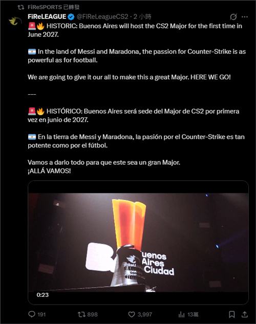 赛事主办方FiReSPORTS正式宣布,2027年CS2 Major锦标赛将于6月在阿根廷首都布宜诺斯艾利斯举办,这将是南美大陆继2022年里约之后第二次迎来CS项目的最高级别赛事。