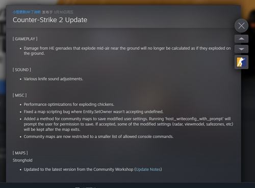为社区地图添加了保存用户修改设置的功能。当运行“host_writeconfig_with_prompt”命令时,系统会提示用户是否允许保存,若允许,部分如雷达、视图模型等修改设置将在退出地图后保留。此外,社区地图现在仅能使用一份经过精简的允许控制台指令列表。地图“Stronghold”也已同步更新至创意工坊的最新版本。