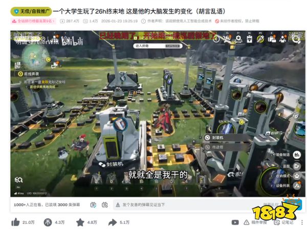 然而只过了两天,舆论风向就发生了180度大转弯。1月23日晚,一条「大学生玩了26小时终末地」的视频引爆社区,入选热门,如今动不动还有3000+的同时在看。到了周末,B站上出现了大量播放量超过200万的攻略视频,各种奇葩的整活视频开始大行其道。