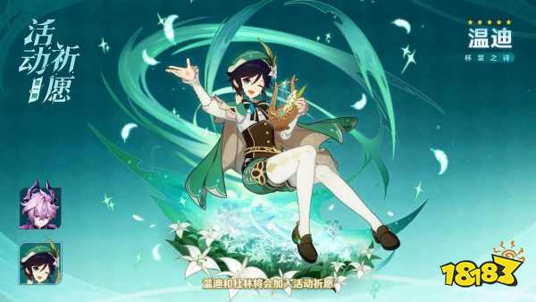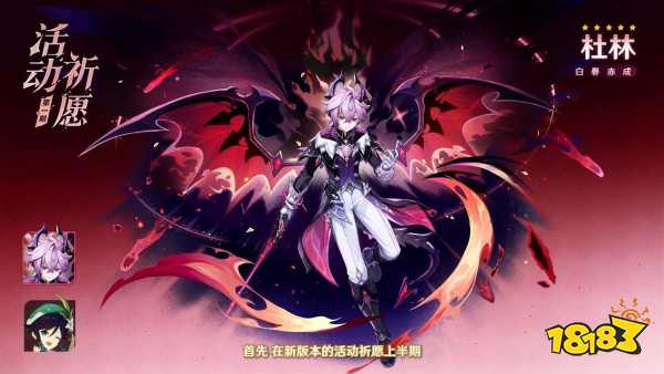 在「月之三」版本第一期角色活动祈愿中,游戏内将同时开放角色活动祈愿「白礜赤成」与角色活动祈愿-2「杯装之诗」。全新限定五星角色「『不熄灭的火』 · 杜林(火)」将出现在角色活动祈愿「白礜赤成」中,限定五星角色「风色诗人 · 温迪(风)」则在角色活动祈愿-2「杯装之诗」中迎来返场。全新四星角色「系风攘影 · 雅珂达(风)」将出现在角色活动祈愿「白礜赤成」、「杯装之诗」中,获取概率大幅提升。