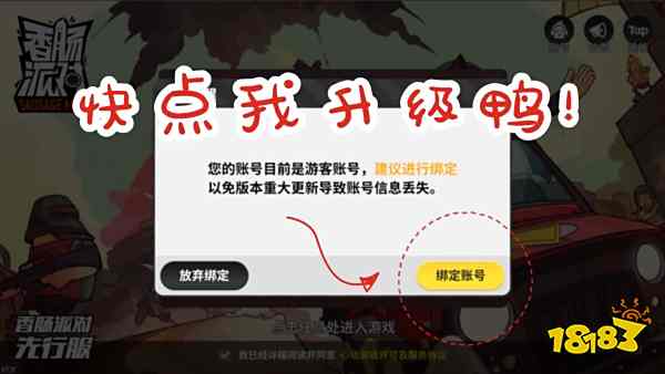 《香肠派对》将于 2019 年 1 月 下旬版本更新时进行客户端安全升级,届时仍然为游客账号的玩家可能会丢失游戏数据。因此请广大游客账号尽快升级为正式账号,以免游戏数据丢失。