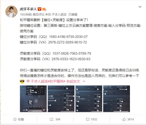 和平精英一哥不求人又出【键位+灵敏度】设置分享了,并且在微博喊话粉丝:“你们一直催的键位和灵敏度安排上了,但还是那句话,灵敏度还是得自己去训练场调试摸索怎样才是适合你的,操作方法也是因人而异的,兄弟们可以参考一下”。从微博内容上来看,不求人不仅详细地写出了微信区和QQ区的游戏键位设置分享码,还贴心的截图示意如何操作,吸引了广大玩家的关注。