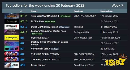 Steam公开了上一周(截至2月20日)的销量排行,第一名由CREATIVE ASSEMBLY开发制作的《全面战争:战锤3》夺得;FS社新作《艾尔登法环》预购在本周冲上了周销榜第二名。格斗游戏新作《拳皇15》的两种版本也登上了周销榜前十。而《赛博朋克2077》也因近期的1.5版本更新再度进入榜单。