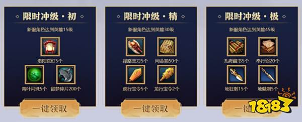 玩家在新服任意角色达到英雄15、30、45级后,可在活动页面领取对应奖励至新服角色。