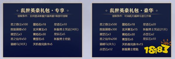 1月13日起,所有玩家入驻新服【双线七区-云溪鹿鸣】并升至英雄1级即可在游戏中领取乱世英豪礼包·专享。可直接使用,也可通过消耗天威神令将【乱世英豪礼包·专享】升级为【乱世英豪礼包·豪华】,道具全面升级。