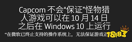 在一则简短声明中,卡普空表示自微软停止对Windows 10支持的10月14日起,公司将“不再保证《怪物猎人世界》《怪物猎人崛起》和《怪物猎人荒野》的游戏能够在Windows 10系统上运行”。