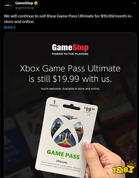 值得一提的是,该原价并不会很快失效,至少目前,不论是在门店还是线上,GameStop的Game Pass Ultimate订阅卡依然是 19.99 美元/月。最合理的解释是,GameStop之前批量购入了一大批订阅卡,而且卡片本身就是19.99美元,必须先清库存。等这些卡用完之后,后续自然会换成印着29.99美元的新卡。