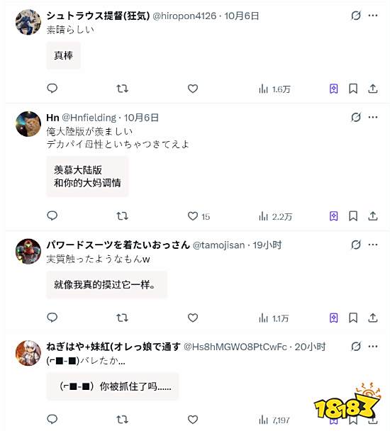 同时,也有日本网友对角色在日本版中的尚未实装表达了遗憾,表示“虽然这位角色在日本版还没有实装,但她的尺寸实在是太夸张了”。另一位网友则调侃道:“我真羡慕大陆版,真想跟这位大X女性角色调情”。