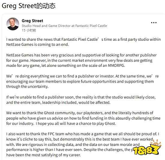 知名游戏设计师“鬼蟹”Greg Street(曾任《魔兽世界》《英雄联盟》首席系统设计师)于2025年10月初在领英平台透露,其领导的Fantastic Pixel Castle工作室开发的奇幻MMORPG《代号Ghost》因初始投资方网易撤资而面临项目终止危机。工作室已与网易共同寻求接盘发行商,但当前市场环境下进展艰难。鬼蟹坦言若无法及时找到新发行商,工作室可能关闭,并鼓励团队成员另谋出路。此次事件并非孤例,由前BioWare与Bethesda资深成员组建的T-Minus Zero工作室此前也遭遇网易撤资 。