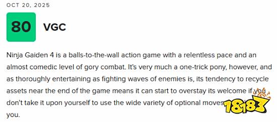 2025年10月21日,《忍者龙剑传4》正式发售,Metacritic媒体评分解禁,Xbox Series X版均分83分(36家媒体),PC版82分(22家媒体),PS5版81分(22家媒体)。DualShockers给出95分满分盛赞战斗系统进化,IGN、GameSpot等多数媒体肯定其高速战斗的爽快感与视觉表现,但普遍指出剧情深度不足、后期内容重复及Boss战设计不稳定等问题,形成“战斗极致爽快,叙事略显单薄”的评价共识 。