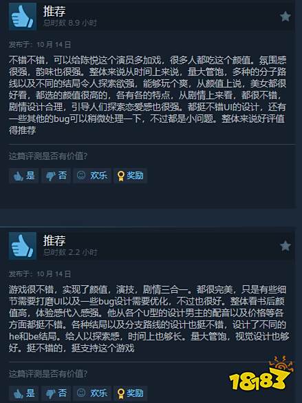 有玩家表示,本作实现了颜值,演技,剧情三合一,游戏的剧情也是量大管饱,多种路线和不同结局让玩家探索欲很强。