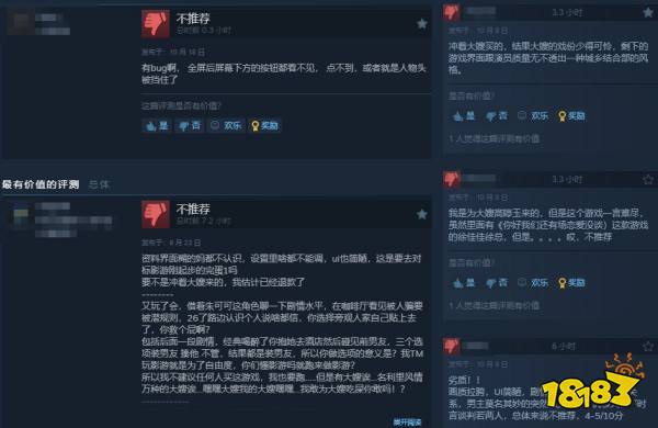 给予差评的玩家认为,冲着大嫂买的游戏,结果大嫂戏份少得可怜。游戏剧情拉跨,剪辑恶心。本作UI设计仍需打磨,一些Bug有待修复。