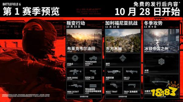 《战地6》第一赛季分成三个阶段陆续推出,分别是叛变行动(10.28),加利福尼亚抗战(11.18)和冬季攻势(12.9),带来全新武器、装备、小工具、地图,以及为门户模式准备的每月更新内容。
