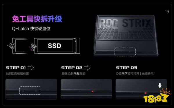 除GPU之外,ROG魔霸新锐2025的其他配置也不容小觑。全新一代酷睿Ultra7 255HX处理器20核20线程,睿频可达5.2GHz,支持APO游戏加速器,游戏表现更优。此外还有1TB PCIe 4.0 SSD与16GB DDR5内存,数据疾速传输,游戏场景加载更迅捷。同时ROG魔霸新锐2025还预留有内存与固态的扩容插槽,支持PCIe 5.0 SSD的升级,更有免工具快拆设计和光感断电功能进一步降低拆机升级的门槛,小白也能轻松上手升级爱机。