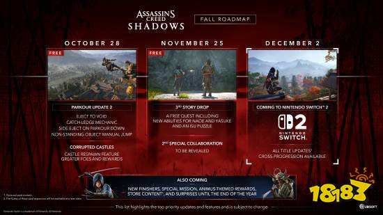 《刺客信条:影》已于2025年10月24日由育碧正式官宣,确定将于12月2日登陆任天堂Switch 2平台,售价59.99美元(约合人民币425.7元)。该版本将支持全菜单触屏操作(包括地图、商城及藏身处管理)并实现跨平台进度同步;同期公布的秋季更新路线图显示,游戏将于10月28日推出“进阶跑酷”模式,移除移动轨道限制,大幅提升动作自由度。Switch 2版首批发售的实机截图因其精细画质与特效处理获广泛好评 。
