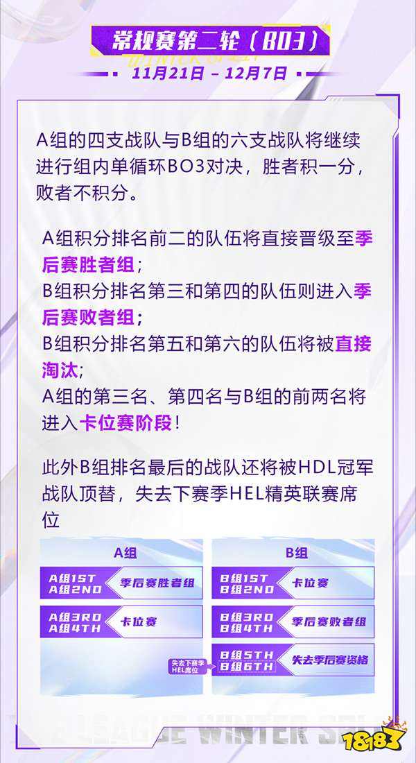 在常规赛第二轮中,A组的四支战队与B组的六支战队将继续进行组内单循环BO3对决,胜者积一分,败者不积分。在单循环结束后,A组积分排名前二的队伍将直接晋级至季后赛胜者组,而B组积分排名第三和第四的队伍进入季后赛败者组,B组积分排名第五和第六的队伍将被直接淘汰。B组的第六名还将被HDL冠军顶替失去下赛季HEL精英联赛席位。而A组的第三名、第四名与B组的前两名将进入卡位赛阶段!