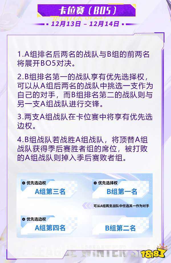 进入到卡位赛阶段,A组排名后两名的战队与B组的前两名将展开BO5对决,由享有优先选择权B组排名第一的战队从A组后两名的战队中挑选一支作为自己的对手,而B组排名第二的战队则与另一支A组战队进行交锋。两支A组战队在卡位赛中将享有优先选边权。B组战队若战胜A组战队,将顶替A组战队获得季后赛胜者组的席位,被打败的A组战队则掉入季后赛败者组。