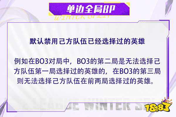 本届赛事全程采用单边全局BP赛制,这是默认禁用己方队伍已经选择过的英雄的比赛模式。例如在BO3对局中,BO3的第二场是无法选择己方队伍第一场选择过的英雄的,在BO3的第三场则无法选择己方队伍在前两场选择过的英雄。