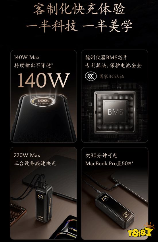 这款充电宝支持 220W Max 三口快充、140W 持续输出,支持 PD 3.1、UFCS、PPS 等协议,可在约 30 分钟的时间里将 MacBook Pro 充至 50%。它还支持 Turbo Boost 闪速自充,约 30 分钟可自充至 50%。