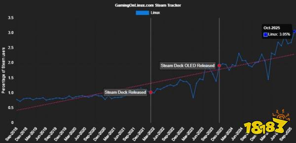 2025年10月Steam硬件调查显示Linux玩家占比达3.05%,首次突破3%大关,实际用户规模超400万;增长主因系Steam Deck掌机(占Linux系统27.18%)带动及Proton兼容层突破(90%Windows游戏可运行),叠加Windows 10停更促使部分用户迁移。