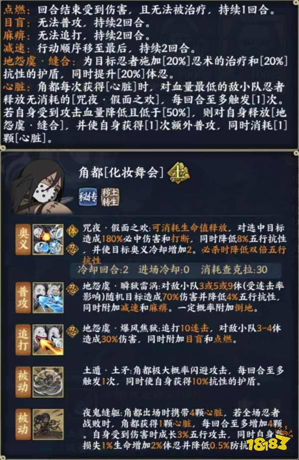 被动Ⅱ:夜鬼缝躯:角都出场时携带4颗心脏,若全场忍者战败时,角都获得1颗心脏,每回合至多增加4颗。自身受到伤害时成长3%五行攻击,同时自身每损失1%生命增加2%体忍并降低0.5%防抗。