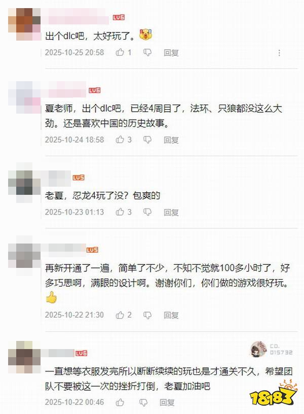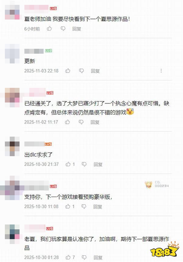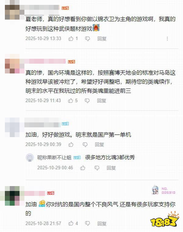 有不少玩家通关《明末》后送上好评,还有许多人在夏思源B站最后一条动态下送上支持和关心,他们对游戏更新后的质量表达了肯定,并鼓励夏思源不要灰心丧气,做出更优秀的国产单机作品!