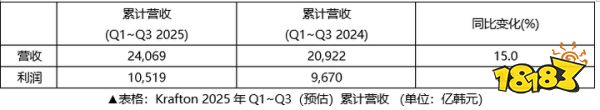 根据韩国国际会计准则(K-IFRS)编制的合并财务报表,KRAFTON第三季度营收达8,706亿韩元,同比增加1,513亿韩元(+21%);营业利润为3,486亿韩元,同比增加242亿韩元(+7.5%)。截至今年第三季度,公司累计营收达2兆4,069亿韩元,营业利润达1兆519亿韩元,首次在前三季度突破1兆韩元营业利润,创下历史新高。