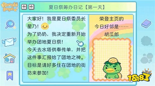 因此,在游戏中玩家的目标就是扮演主角星乃,通过完成游戏中邻居们的各种任务解决他们所遇到的难题,以重新唤醒他们因各种压力而逐渐失去的对夏日祭的期望与喜爱。