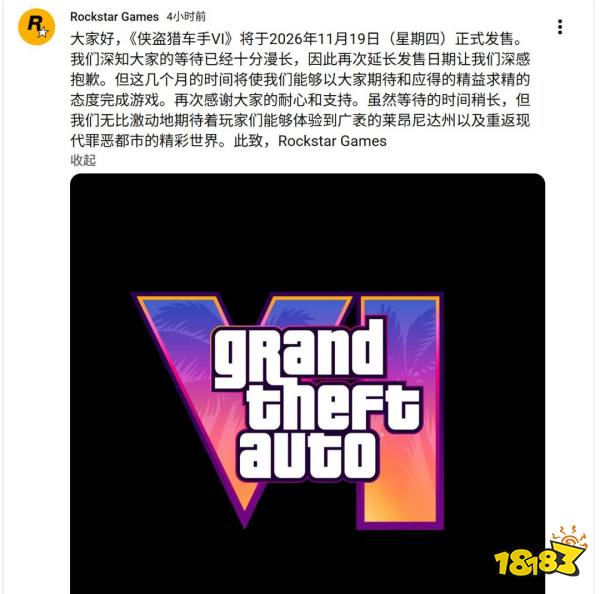 R星宣布《GTA6》发售日再次延期,从原定2026年5月26日推迟至同年11月19日,此次为游戏自公布以来的第三次跳票;官方解释需额外时间打磨品质,玩家社群呈现"理解支持"与"失望不满"的两极反应,而《荒野大镖客2》的跳票成功先例让部分玩家对最终品质保持信心。