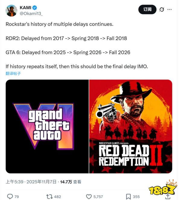 类似的是,《GTA6》从2025年跳票到2026年春季,然后又从2026年春季跳票到2026年秋季。如果《荒野大镖客2》可以参考的话,似乎这将是《GTA6》最后一次跳票。