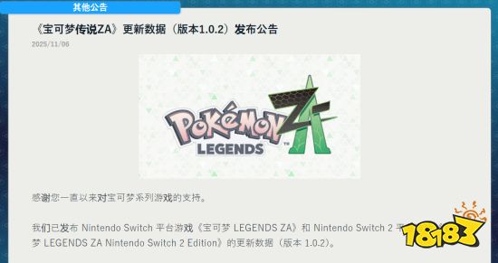 11月6日,《宝可梦传说:Z-A》日文官网确认,Game Freak 已正式推出 1.0.2 版本更新。本次更新修复了多项严重Bug,包括 宝可梦盒子容量导致无法捕捉问题、昼夜交替卡任务进度、以及 训练家对战中超级进化引发的战斗中断 等。此外,官方还对 排位赛积分机制与奖励平衡性 进行了优化。 值得注意的是,DLC《超次元爆涌》最新情报将于今晚公开,并将在官方YouTube频道发布预告视频。