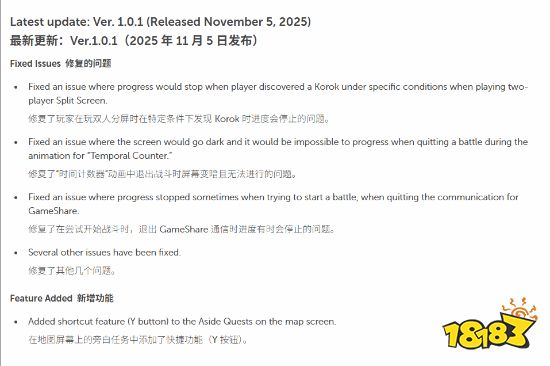 任天堂与光荣特库摩于 2025年11月5日 推出了《塞尔达无双:封印战纪》Ver.1.0.1更新补丁。本次更新主要修复了包括 双人分屏克洛格事件卡进度、时停反击动画导致黑屏、以及 分享通信中断引发的进度停止 等关键Bug。同时,版本中还新增地图功能,提升了游戏的可玩性与整体稳定性。