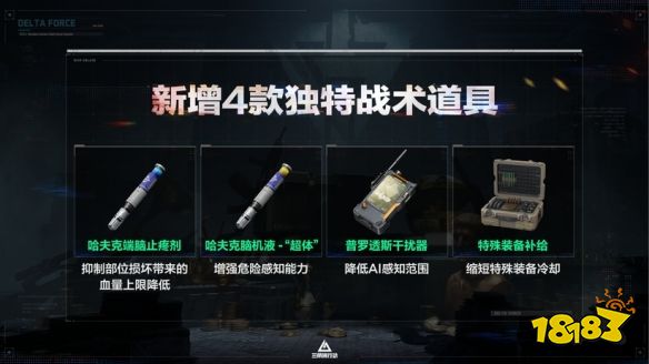 而在战术道具部分,新增了4款特殊的战术道具。哈夫克端脑止疼剂可抑制部位损坏带来的血量上限降低;哈夫克脑机液-“超体”可增强危险感知能力;普罗透斯干扰器可降低AI索敌距离;特殊装备补给—可大幅缩短技能冷却,为各位干员带来了更多策略选择。
