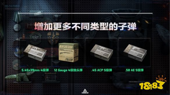 在子弹类型部分加入了5.45x39mm 4级弹加强版、12 Gauge 4级独头弹加强版、.50 AE 沙鹰5级弹、 .45 ACP 5级弹等,带来不同的攻防体验。当然了,这些在属性上颇有吸引力的子弹是在军需处限购的,无法上架交易。