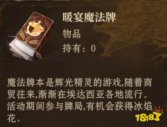 【暖宴牌局】的传统源于辉光精灵一族。每当凛冬将至、风雪弥漫之时,这些优雅的生灵便会聚集在温暖的篝火旁,一边分享美食,一边进行充满智慧与趣味的魔法牌局游戏。这种兼具社交与娱乐的活动,不仅帮助他们驱散了冬日的严寒,更成为了文化传承的重要纽带。随着埃达西亚大陆各区域间商贸往来的日益频繁,这一富有魅力的活动也逐渐流传开来,风靡各地。如今,埃达西亚的朋友们也向所有旅者发出诚挚的邀请,期待大家的加入,共同围炉欢聚~