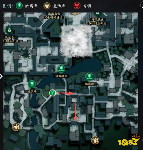搜完后,院内就没有东西了。我们直接出大门,大门对面的墙下有概率刷中低级棺椁。搜完后,各位少侠直接右转,随后在第一个胡同口左转。前方就是“镇海塘”撤离点。