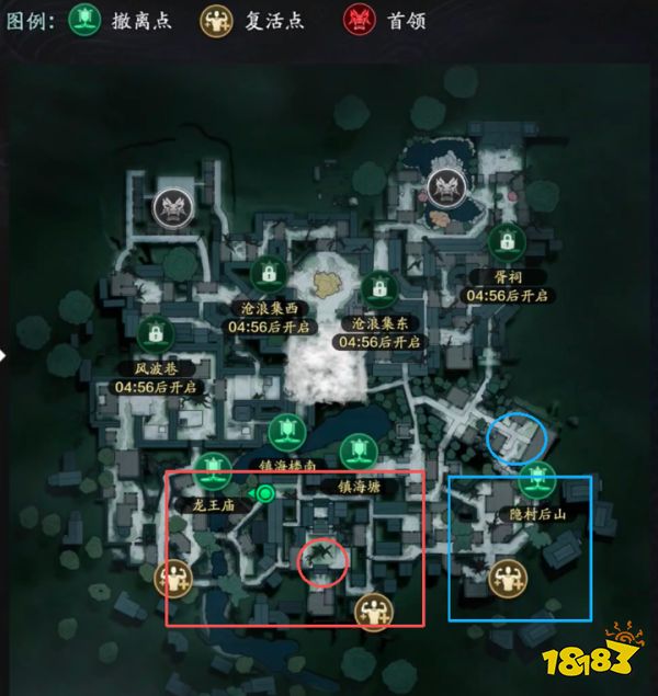 只要大家出生在红框区域内,那么我们的目标只有一个,位于地图下方中心的大院落。