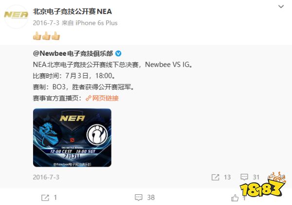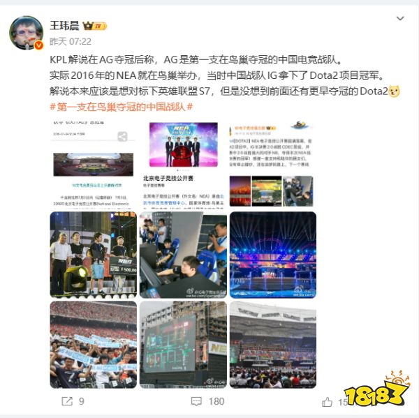 在此次争议中,一个被多数KPL观众忽视的历史事实被重新提起:2016年NEA(国家电子竞技大赛)总决赛在鸟巢举办,王思聪旗下的IG俱乐部DOTA2战队击败Newbee夺冠,IG中单Ana更是在此次赛事中崭露头角,转会OG战队后连续斩获TI8、TI9冠军,创下了TI两连冠历史。
