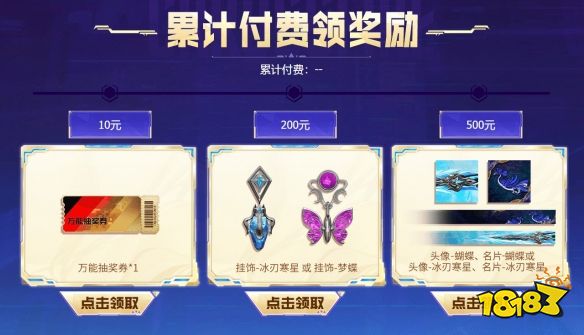 玩家累计付费达到指定金额即可领取对应奖励:累计10元可领取一张万能抽奖券,累计200元可领取挂饰-冰刃寒星或者挂饰梦蝶二选一;累计500元可全部领取头像/名片-蝴蝶&冰刃寒星!参与消费的CFer们记得来领取奖励哦!