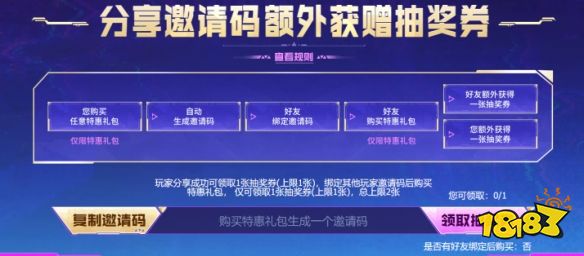 CFer在购买特惠礼包后,可分享邀请码给好友,好友绑定邀请码后,购买任意特惠礼包,CFer和好友都可额外领取1张抽奖券。每位CFer都可通过绑定好友邀请码与分享邀请码给好友获取最多2张抽奖券。快来分享给好友们一起领取抽奖券吧!